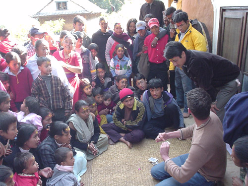 Wieland in Nepal 10 Ich habe schon lange versprochen, die Fotos von Wieland aus Nepal zu schicken: Zauberer hat das Dorf Dolalghat - 60 km oestlich von Kathmandu - bis dahin noch nicht gesehen - und so schauen sie alle zu, gross und klein. Tja, das war dann wohl Wielands vorletzter wirklich noch schoener Monat im Leben. Es folgte die Indienfahrt und der Absturz, den auch ich damals absolut unterschaetzt ! Andreas 2004-11-13